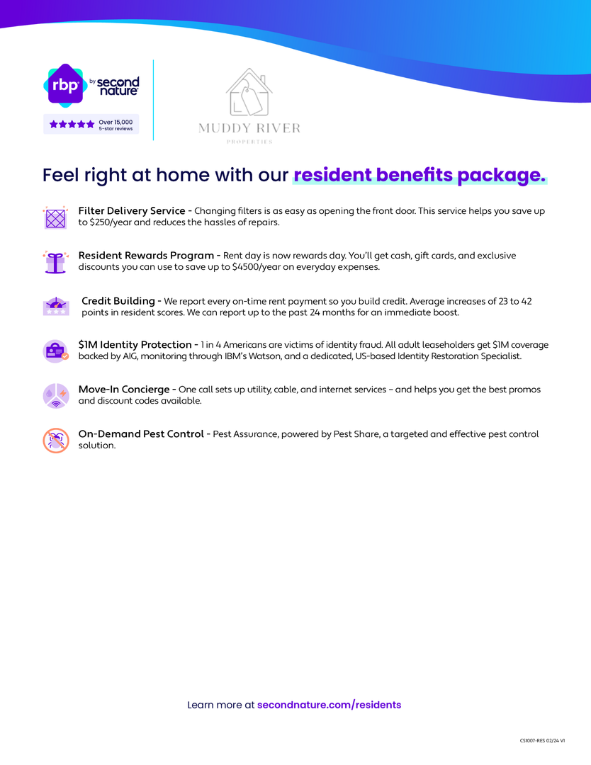 At Muddy River Properties, we strive to provide an experience that is cost-effective and convenient. That’s why we provide a Resident Benefits Package (RBP) to address common headaches for our residents. Our program handles pest control, air filter changes, utility set up, credit building, rent rewards, and more at a rate of $40/month, added to every property as a required program. More details upon application.